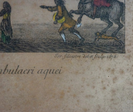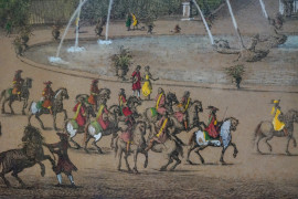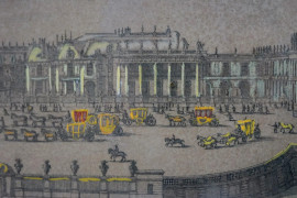 Vedute del Castello Reale di Versailles, coppia di stampe a colori, cm 47x60, fine XIX secolo, entro cornici, (macchie sulla carta).