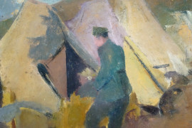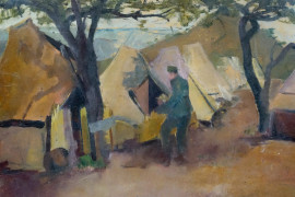 Accampamento con ufficiale, olio su carta applicata su tavola, cm 31x44, XX secolo, entro cornice.