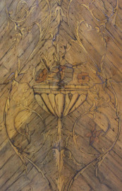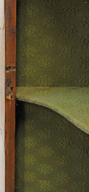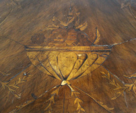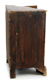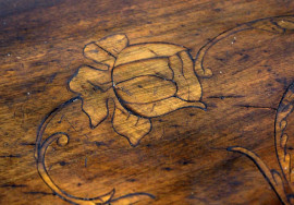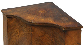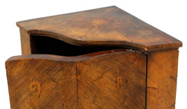 Angoliera in noce, XIX secolo, piano di linea sagomata, fronte ad uno sportello riccamente intarsiato a motivo di vasi, fiori e volute, piedi a mensola, cm h 95x70x49, (difetti e parti sostituite).