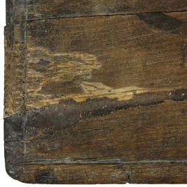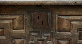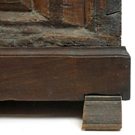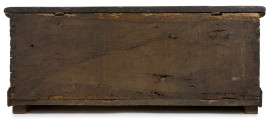 Antica cassapanca in castagno, parte frontale con decori geometrici scolpiti, cm h 55x140x52, (difetti e parti sostituite).