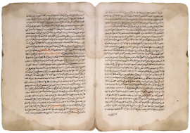 Antica rara doppia pagina manoscritta in caratteri arabi vergati a inchiostro bruno e lacca rossa, Persia, XVI sec.
