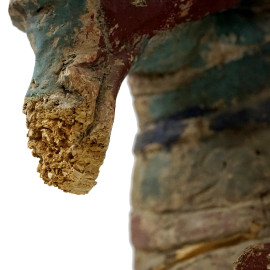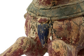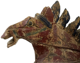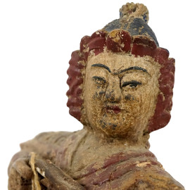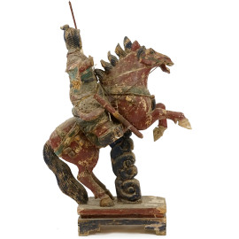 Arciere a cavallo, antica scultura in legno intagliato e dipinto, cm h 90x68x19, Cina, (difetti).