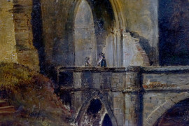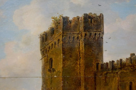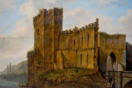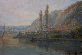 Attr.a Joseph Carl Cogel (1785-1831), Castello sul lago, olio su tavola, cm 32x49,5, firmato, entro cornice.