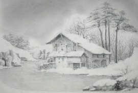 Baita, disegno a matita su carta, cm 13,5x 17, XX secolo, entro cornice