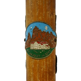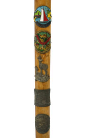 Bastone alpino in legno con placche e rilievi in metallo a smalti policromi, lughezza cm 90,5x20, (difetti).