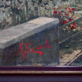 Campanile, olio su tela riportata su cartone, cm 58x48, firmato, entro cornice.