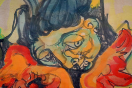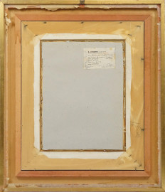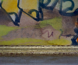 Donna che rincorre il gallo, gouache su carta, cm 40x30,5, entro cornice, recante etichetta a retro.