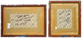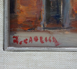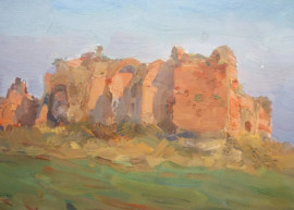 Scorcio di borgo e Campagna romana, due dipinti ad olio su cartone telato, misure max cm 20x34, entro cornici.