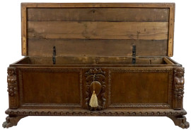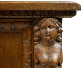 fronte con scudetto centrale intagliato e lesene a foggia di cariatidi, cornicione sottostante baccellato sorretto da piedi anteriori ferini.