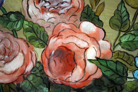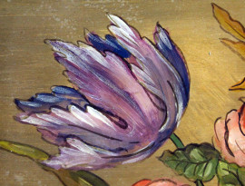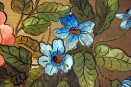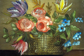 Cesta di fiori, dipinto su vetro, cm 36,5x23, XX secolo, entro cornice.