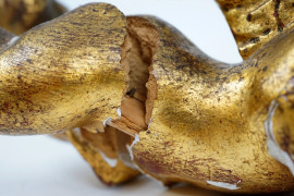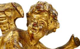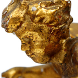 Coppia di angioletti in legno dorato scolpiti a tutto tondo, XX secolo, cm 22x11, (difetti, un restauro e parti rotte).