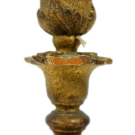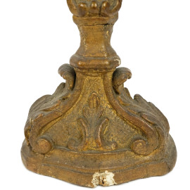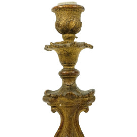 Coppia di candelieri in legno intagliato e dorato, XIX secolo, trasformati a lampada, cm h 28,5, (restauri)