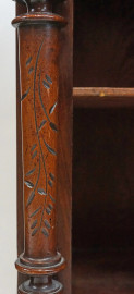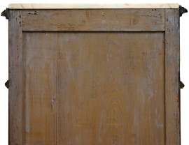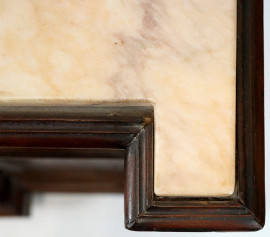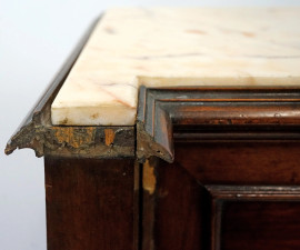 Coppia di comodini impiallacciati, inizi XX secolo, piano in marmo, fronte ad un cassetto ed uno sportello incorniciati da colonnine scolpite, piedi a trottola, cm , (difetti)