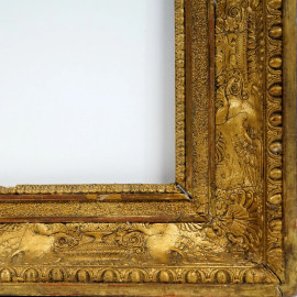 Battuta interna a fregio ondulato seguita da fascia piatta bulinata, gola decorata con grifoni alati e vasi che si fronteggiano, battuta esterna ad ovuli e controbattuta a palline.