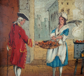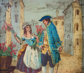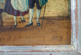 Coppia di dipinti raffiguranti figure settecentesche, olio su tavola, cm 17,5x12,5, firmati Remy, entro cornici