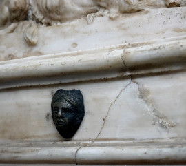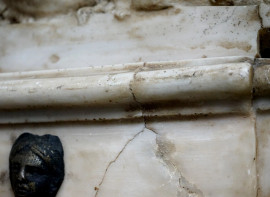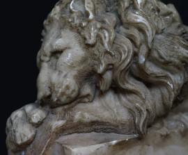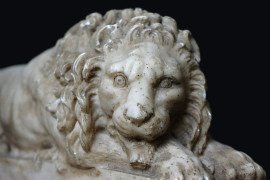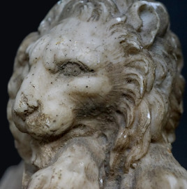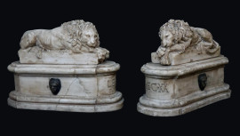 Coppia di leoni con basi in pasta di marmo, cm h 29, cm h 29x40x16.