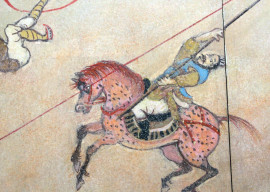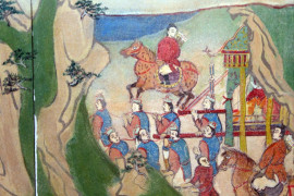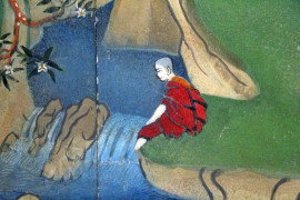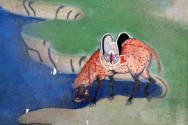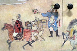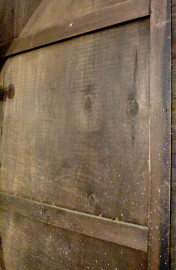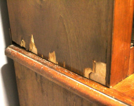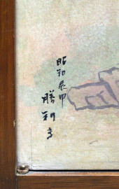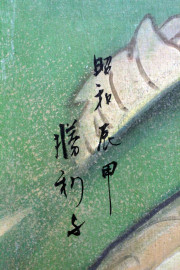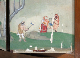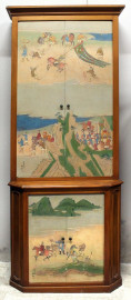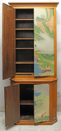 Coppia di librerie a doppio corpo anni '50 in noce, con quattro sportelli decorati a cineserie, cm h 230x97x44, (difetti)