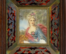 Coppia di miniture raffiguranti dame, con cornici in finta tartaruga, cm 16,5x14,5