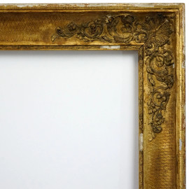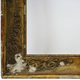 Cornice in legno intagliato inciso e dorato, fine XIX-inizi XX secolo, misure ingombro cm 108x134, misure luce cm 121,5x96, (difetti)