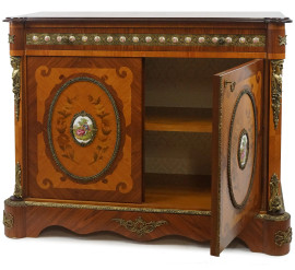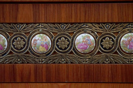 fronte ad un cassetto e due ante con placche in porcellana policroma raffiguranti scene galanti, cm 99x120x51, (difetti).