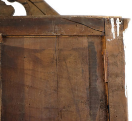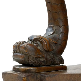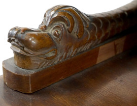 Credenza in noce, XIX secolo, cimasa scolpita, parte superiore a due ante a vetri, parte inferiore a due cassetti poggianti su montati scolpiti a foggia di creature marine, cm h 190x79x27, (difetti).