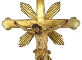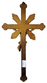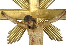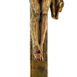 Crocifisso in legno intagliato, dorato e dipinto in policromia, XVIII secolo, cm 66x37, (difetti).