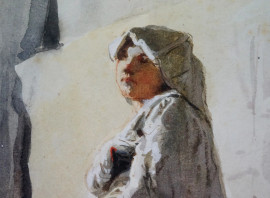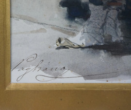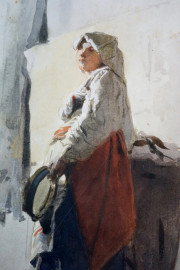 Donna con tamburello, acquarello su carta, cm 28,5x16,5, firmato Pagliano, entro cornice