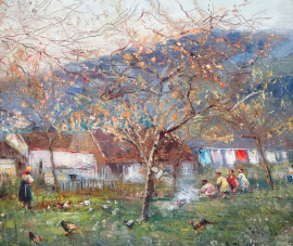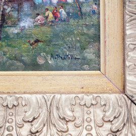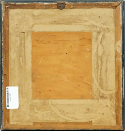Esterno di casolare con figure, olio su tavola, cm 21x19, firmato, entro cornice.