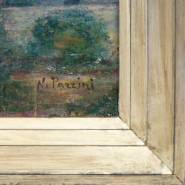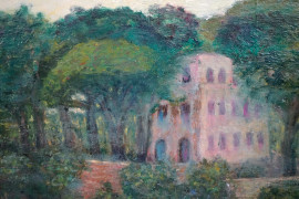 Esterno di villa, olio su tavola, cm 25x35, firmato, entro cornice.