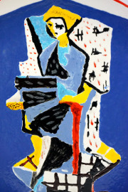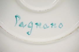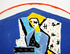 Grande piatto in ceramica dipinta e smaltata in policromia raffigurante donna astratta, diam. cm 34,5, firmato Gigi Pagnano.