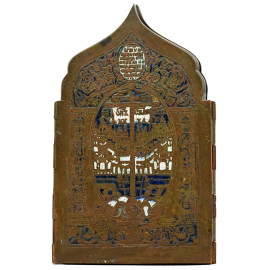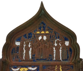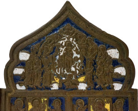 in bronzo e smalti policromi, decorata con scene della vita di Cristo e della Vergine, cm 18x10, misure icona aperta cm h 18x40, (difetti)