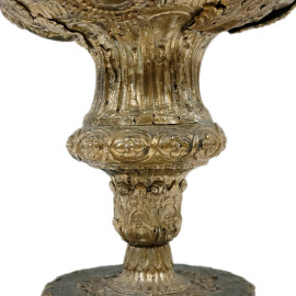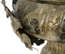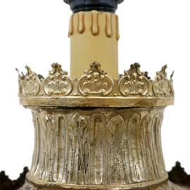 Lampada in lamina di metallo argentato, corpo a balaustro con decori incisi e sbalzati, cm h 60, (difetti e mancanze)