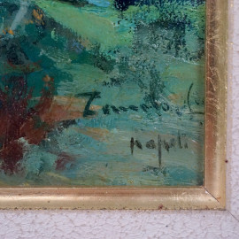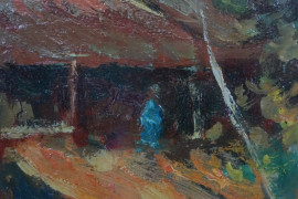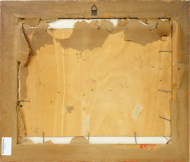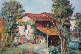 Paesaggio con casolare, olio su compensato, cm 35x50, entro cornice.