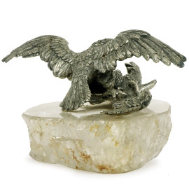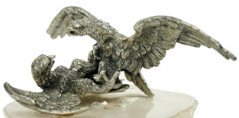 Lotta tra aquile, scultura in metallo argentato, base in cristallo di rocca, cm 12x22, XX secolo