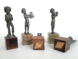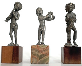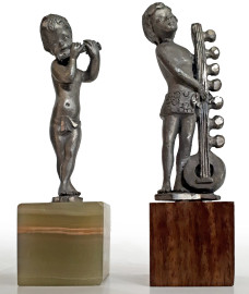 Lotto composto da cinque statuine vintage raffiguranti piccoli musicanti realizzate in peltro finemente cesellato a mano e montate su basi in onice e in noce, altezza cm 12