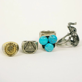 Lotto composto da due anelli in argento, due anelli in metallo ed una collana, misure 23, 19, 16 e 22, lunghezza collana cm 46, (segni di utilizzo).