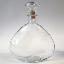 Lotto composto da tre bottiglie, una in vetro blu design stile Monica Bratt Wijkander, e due in cristallo trasparente, varie dimensioni e fogge, altezza massima cm 26