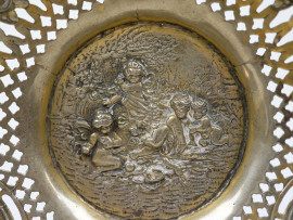 Lotto composto da un raccoglibriciole ed un cestino traforato in metallo argentato, con cavetto raffigurante putti e tesa decorata a roselline, misure max cm 4,5x19, XX secolo, (difetti).