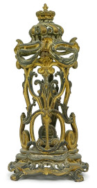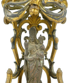 Madonna col Bambino entro edicola, scultura in metallo brunito e dorato, XIX secolo, cm h 25,5