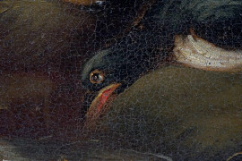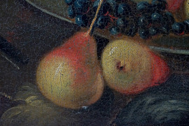 Maestro di ambito lombardo del XVIII secolo, Natura morta con frutta e volatili, olio su tela, cm 57,5x72, entro cornice, (cadute di colore sparse).