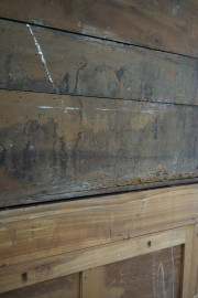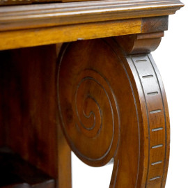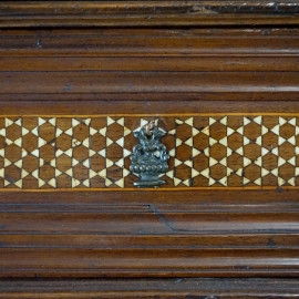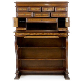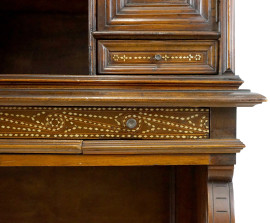 Mobile a doppio corpo in noce, fine XIX secolo, parte superiore a dodici cassettini riccamente intarsiati a motivi geometrici, parte inferiore ad un cassetto e tre ripiani, montanti laterali a sagomati, particolari scolpiti, cm h 165x117x4, (difetti).
