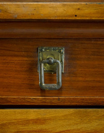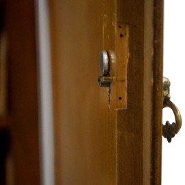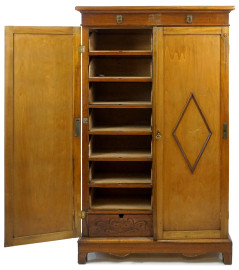 Mobile schedario impiallacciato, metà XX secolo, cappello aggettante, fronte a due sportelli decorati a losanghe, piedi a mensola, cm h 155x95x39, (difetti)
