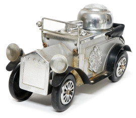 Modellino di automobile in metallo argentato con accendino e posacenere interni, cm h 14,5x26x10,5, XX secolo, (segni del tempo).