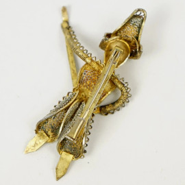 Musicista, spilla in argento con lavorazione a filigrana, cm 6x3, XX secolo, peso gr. 10,2, (lievi difetti).