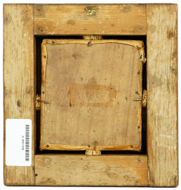 Natura morta, tavola imbandita, piccolo dipinto ad olio su pergamena, XIX secolo, cm 13,5x12,5, entro cornice.