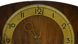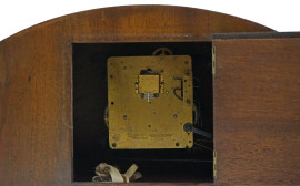 Orologio da camino in noce, Suevia Sindelfingen, Germania, XX secolo, quadrante circolare a numeri arabi in metallo dorato, sportello anteriore in vetro, cm h 21x52,5x15, (meccanismo da revisionare)