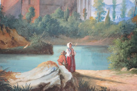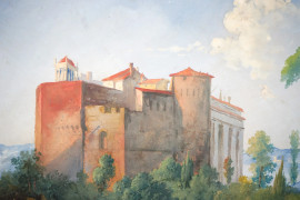 Paesaggio con castello e figure, tempera su carta, cm 24,5x29,5, XIX secolo, entro cornice.