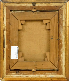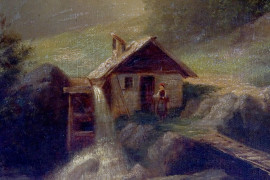 Paesaggio con ponte, olio su tela, cm 25x21, inizi XX secolo, entro cornice.