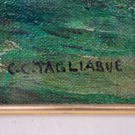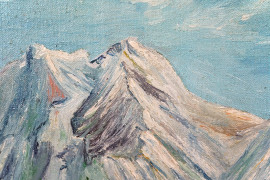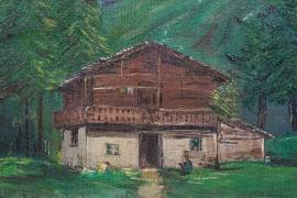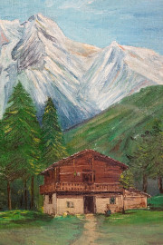 Paesaggio montano con casolare e figura, olio su tela, cm 53x38, firmato, entro cornice.