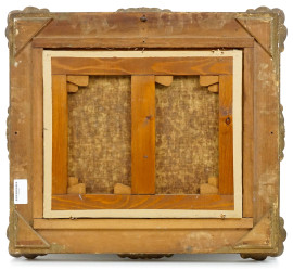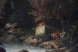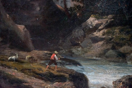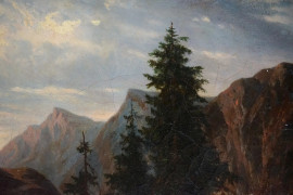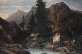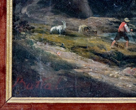 Paesaggio montano con figure, olio su tela, cm 38x46, firmato, entro cornice.